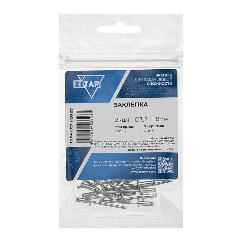 Заклёпка вытяжная 3,2х8 (27 штук) - пакет не имеет сертификатов взрывобезопасности или пищевой безопасности. Применяется исключительно в механических конструкциях вне сред с повышенными требованиями к герметичности или химической стойкости.