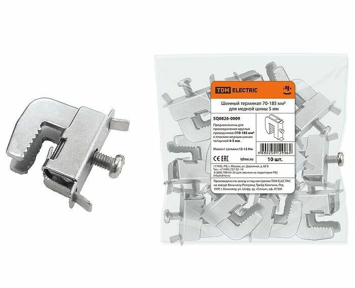 Шинный терминал 70-185 мм2 для медной шины 5 мм от TDM ELECTRIC (артикул sq0826-0009) предназначен для надёжного и быстрого соединения силовых проводов с плоской медной шиной без необходимости сверления. Подходит для установки в распределительных щитах, шкафах управления и других электротехнических сборках.