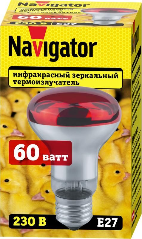 Термоизлучатель 60 Вт E27 ИКЗК от бренда Navigator - это инфракрасный нагревательный элемент с зеркальным отражателем, предназначенный для направленного обогрева. Артикулы 93973 и 30355 подходят для установки в светильники с керамическими патронами, где требуется высокая теплоотдача и минимальная видимая яркость.