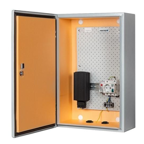 Корпус выполнен в соответствии с требованиями к уличному исполнению и имеет степень защиты IP66, что соответствует международным нормам IEC 60529. Нагреватель и термореле обеспечивают безопасную работу при низких температурах, исключая переохлаждение оборудования. Автоматический выключатель защищает цепь от перегрузок и КЗ. Все элементы установлены внутри корпуса и недоступны при закрытой двери.