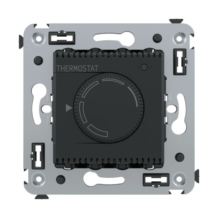 Термостат для теплых полов в стену, черный матовый, DKC - устройство для точного контроля температуры напольного отопления, предназначенное для скрытой установки в подрозеточные коробки. Модель DKC 4412163 из серии Avanti совмещает простую механическую регулировку с надежной работой в бытовых системах теплых полов.
