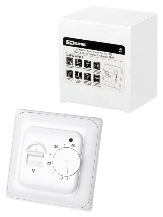 Термостат для теплых полов TDM ELECTRIC SQ1805-1062 совместим со всеми типами электрических тёплых полов: нагревательными матами, одножильными и двужильными кабелями, инфракрасными плёнками. Подключается через силовой контактный блок, который должен быть установлен в распределительном щите.