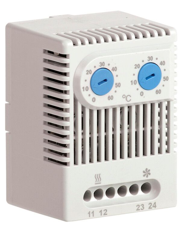 Термостат двухканальный от 0 до +60 градусов Цельсия NO+NO от IEK (артикул yce-dtno-no-60) - устройство для автоматического контроля температуры в электротехнических шкафах, управляющее вентиляторами и нагревателями через два независимых переключающих контакта.