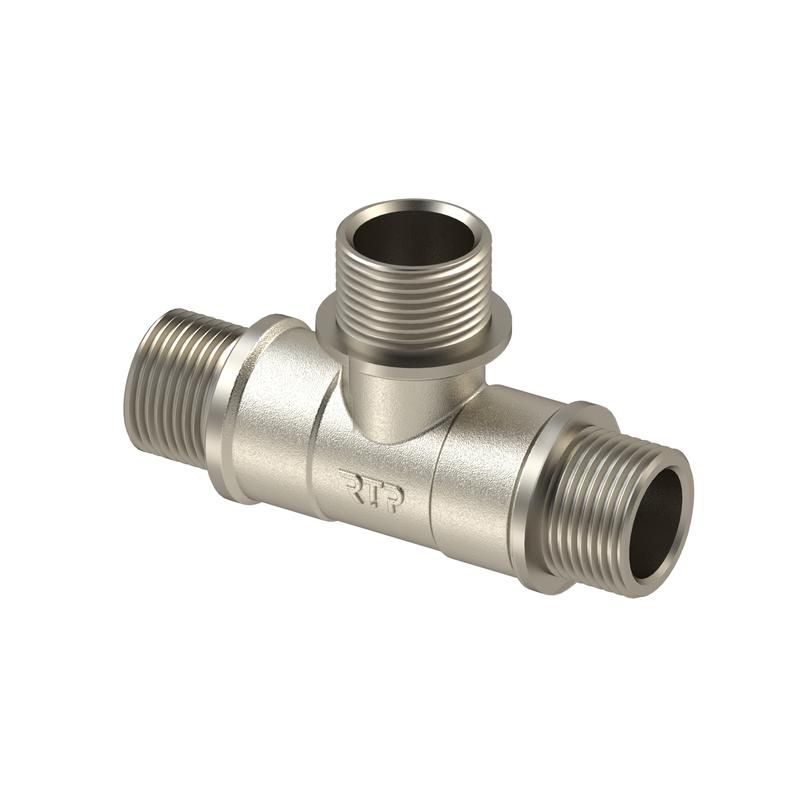 Тройник латунь наружная/наружная/наружная резьба 1/2 дюйм еврослот никель RTP - соединительный элемент из латуни с трёхсторонним наружным резьбовым исполнением, предназначенный для сборки трубопроводов в системах с давлением до 16 бар. Артикул 42246 от бренда RTP подходит для гидравлических и пневматических контуров, где требуется надёжное соединение без сварки.