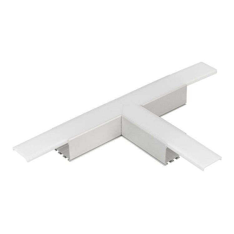 Тройник PLS-LOCK-H25-T90 с экраном MAT-L совместим исключительно с профилями PLS-LOCK-H25. Установка происходит без инструментов: профили просто вставляются в пазы до щелчка. Соединители, входящие в комплект, фиксируют профили внутри тройника. Матовый экран крепится поверх конструкции - он маскирует внутреннюю проводку и создаёт равномерную рассеянную подсветку. Для надёжного крепления проверьте, чтобы все три профиля были одной длины и без деформаций.