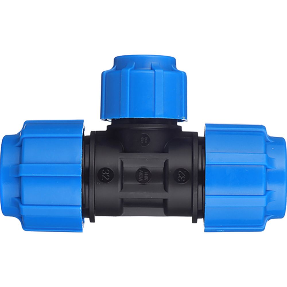 Тройник совместим с трубами из ПНД того же стандарта SDR (например, SDR11, SDR17,6). Для установки используются стандартные обжимные фитинги: на каждый конец надевается обжимная гайка и уплотнительное кольцо, после чего труба вводится внутрь фитинга и затягивается гайкой ключом. Убедитесь, что концы труб обрезаны перпендикулярно и зачищены от заусенцев. Посадочные диаметры труб должны точно соответствовать 32 мм и 25 мм - допуск +-0,5 мм.