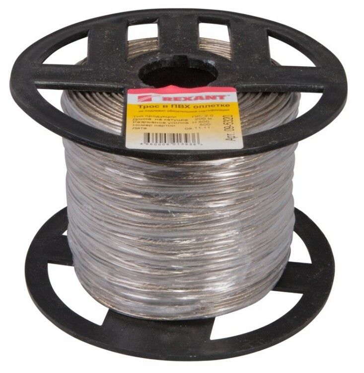 Трос стальной в ПВХ оплетке диаметр 2,0 мм, прозрачный, катушка 200 метров от Rexant (арт. 09-5320) - прочный и долговечный элемент для фиксации статических нагрузок на открытых площадках. Подходит для монтажа рекламных конструкций, освещения, ограждений и тепличных систем.