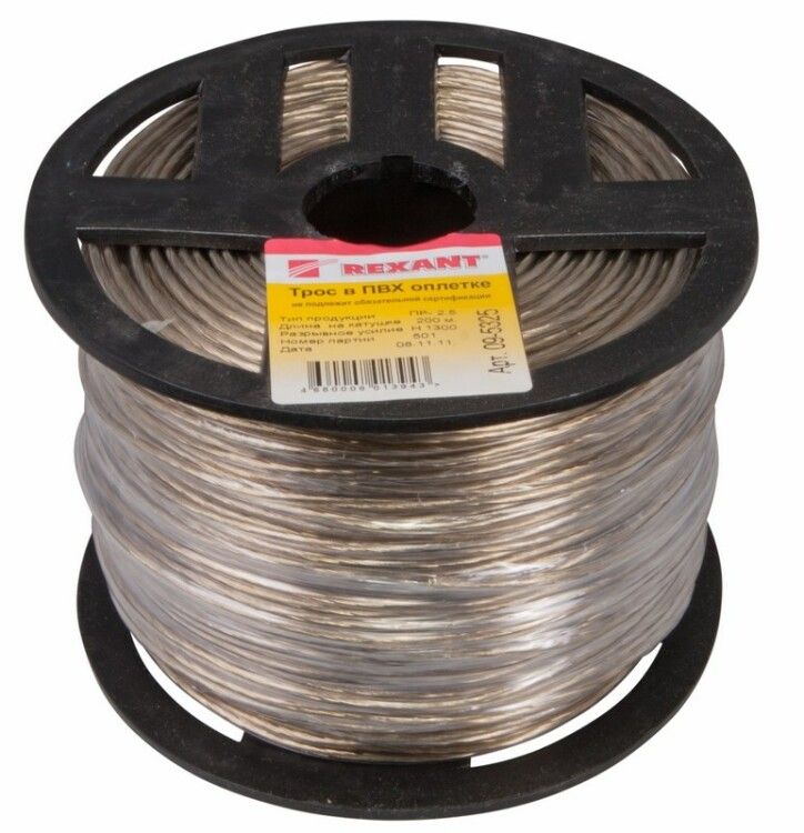 Трос стальной в ПВХ оплетке/изоляции d=2.5 мм, длина 200 м от Rexant - прочный и долговечный элемент для фиксации конструкций под статической нагрузкой. Артикул 09-5325 подходит для наружного и внутреннего монтажа там, где важна устойчивость к влаге и механическая надёжность.