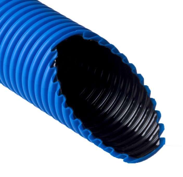 Труба двустенная полиэтилен низкого давления (ПНД) 90/76 мм, синяя совместима с любыми типами кабелей: силовыми, сигнальными, сетевыми. Монтаж выполняется вручную - труба легко гнётся, не требует специальных инструментов.
