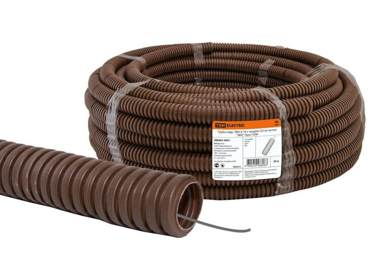 Труба гибкая гофрированная ПВХ диаметр 16 мм с протяжкой легкая (25 м) ЭКО (бук) от TDM ELECTRIC предназначена для прокладки кабелей и проводов в жестких условиях - внутри стен, под полами, в штробах и за потолками. Благодаря наличию стальной протяжки и высокой гибкости, она упрощает монтаж даже в сложных трассах. Артикул sq0401-0041 соответствует требованиям для внутренней электропроводки в зданиях.