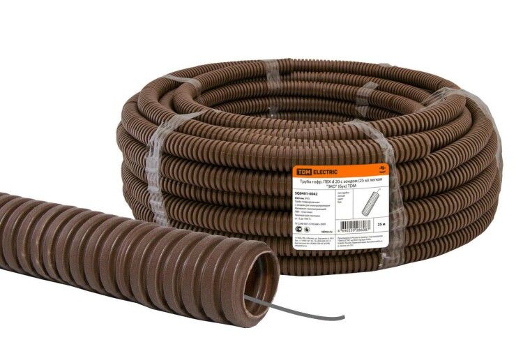 Труба гибкая гофрированная ПВХ d 20 с протяжкой (зондом) легкая ЭКО (25 м) бук - это lightweight-решение для внутренней прокладки слаботочных и силовых кабелей в жилых и общественных зонах. Бренд TDM ELECTRIC предлагает эту модель из серии ЭКО с готовой стальной протяжкой, что ускоряет монтаж и снижает риск повреждения проводов. Артикул sq0401-0042 соответствует требованиям безопасности и удобству для профессионального использования.