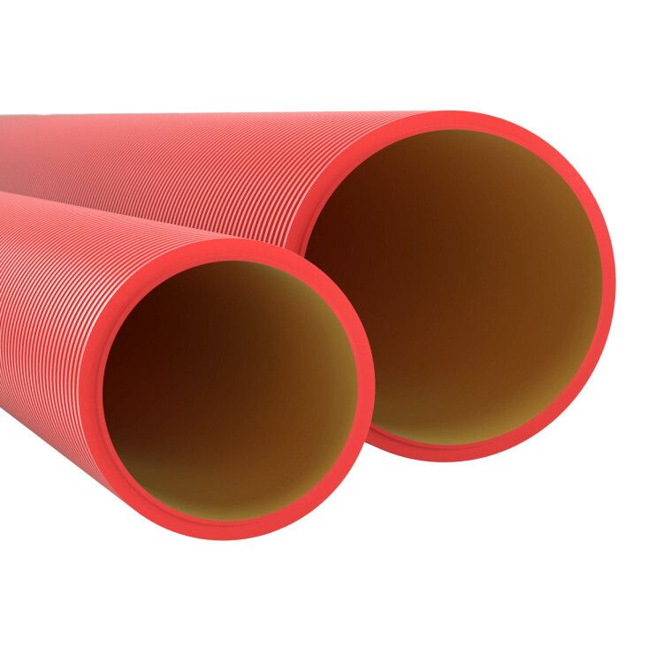 Труба гофрированная двустенная поливинилхлоридная жесткая для кабельной канализации диаметр 125 мм, класс прочности SN10, 980 Н, длина 6 м, цвет красный используется для защиты кабелей от механических повреждений, влаги, химических веществ и перепадов температур. Применяется исключительно в скрытых системах: под дорожным покрытием, в земле, внутри бетонных конструкций, при укладке в каналах, коллекторах и траншеях. Подходит для кабелей низкого и высокого напряжения, особенно там, где есть риск сдавливания - например, под автодорогами, железными путями или в местах прохода через фундаменты.