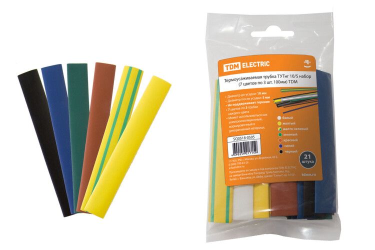 Термоусаживаемая трубка ТУТнг 10/5 набор (7 цветов по 3 шт. 100 мм) от TDM ELECTRIC - это комплект из семи цветов для изоляции, маркировки и защиты проводов и соединений. Каждый цвет представлен тремя отрезками по 100 мм, что удобно для мелкосерийной сборки и обслуживания.