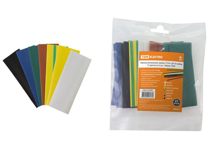 Термоусаживаемая трубка ТУТнг 20/10 набор (7 цветов по 3 штуки 100 мм) от TDM ELECTRIC - это комплект изолирующих и маркирующих трубок на основе полиолефина, предназначенный для защиты и идентификации проводов и соединений в электротехнических системах.
