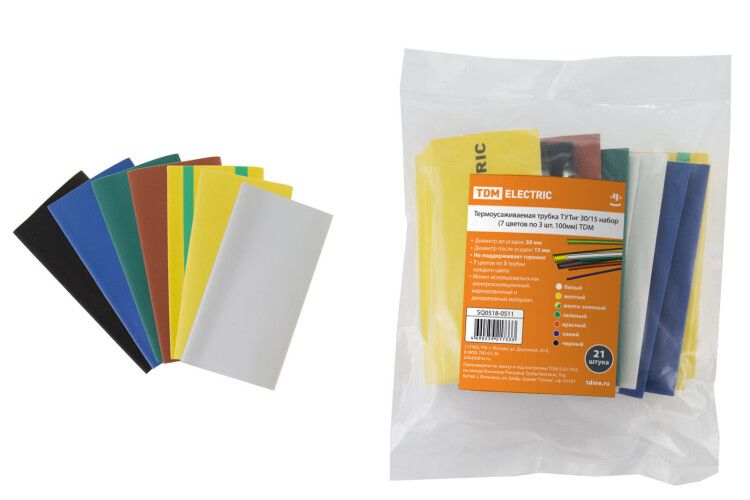 Термоусаживаемая трубка ТУТнг 30/15 набор (7 цветов по 3 штуки 100 мм) от TDM ELECTRIC - это комплект из семи цветов для изоляции, маркировки и защиты проводов и соединений. Подходит для работ в условиях перепадов температур, влажности и механических нагрузок.