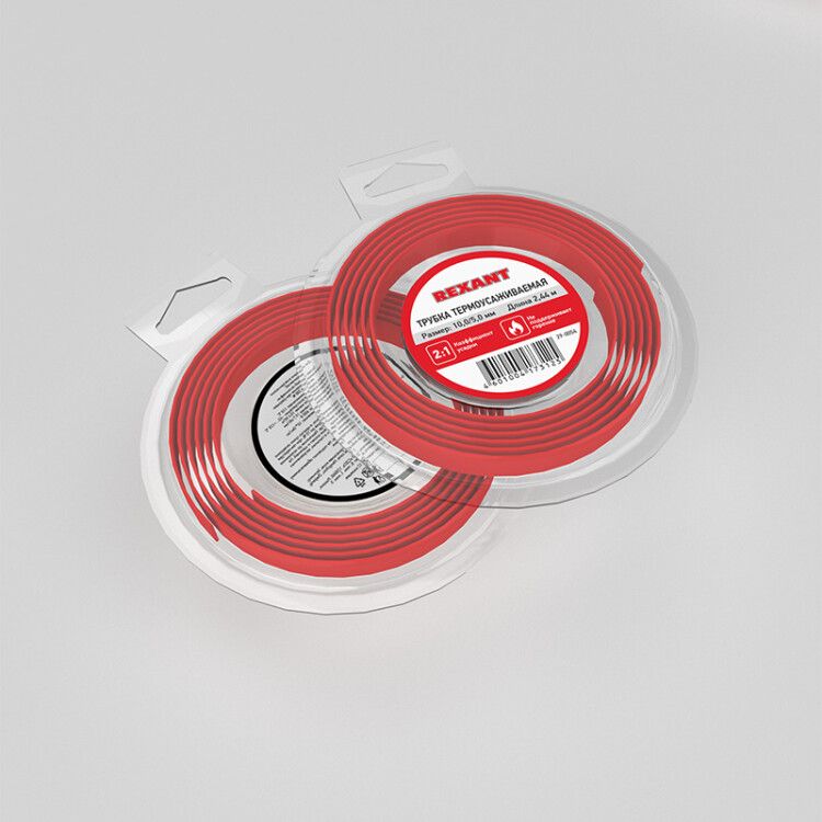 Трубка термоусаживаемая 10,0/5,0 мм красная, ролик 2,44 м от REXANT - это тонкостенный изоляционный элемент на основе полиолефина с коэффициентом усадки 2:1, предназначенный для защиты электрических соединений, герметизации кабелей и маркировки проводов. Артикул etm29-0054 подходит для профессионального монтажа в условиях широкого температурного диапазона.