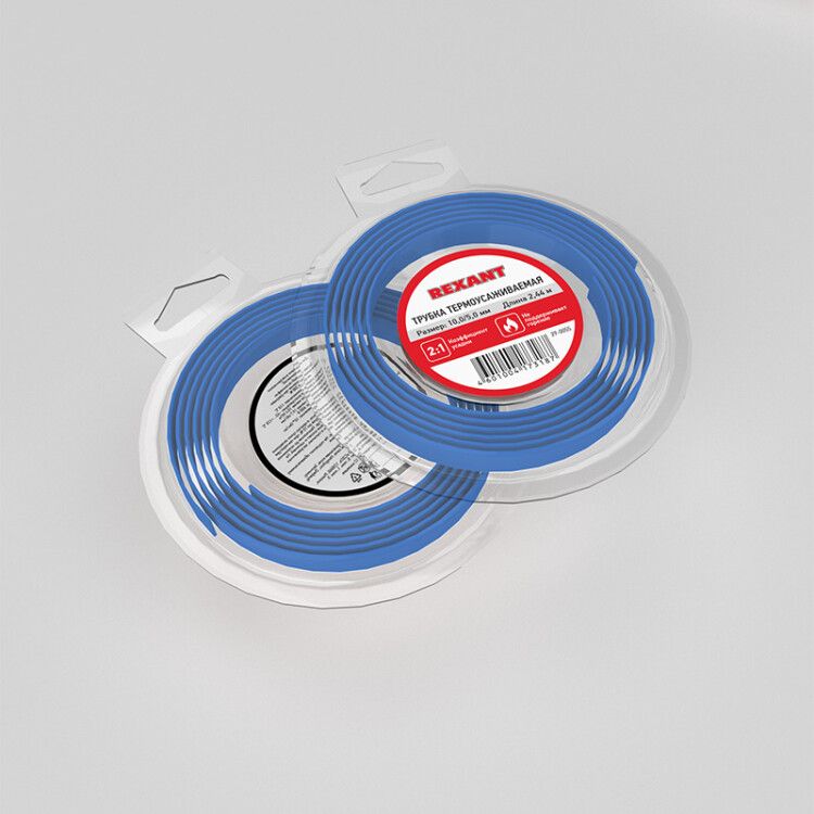 Трубка термоусаживаемая 10,0/5,0 мм синяя, ролик 2,44 м от REXANT - это тонкостенный изоляционный элемент на основе полиолефина с коэффициентом усадки 2:1, предназначенный для защиты электрических соединений, герметизации кабелей и маркировки проводов. Артикул etm29-0055 подходит для профессионального монтажа в условиях широкого температурного диапазона.
