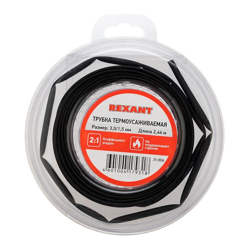Трубка термоусаживаемая 3,0/1,5 мм черная, ролик 2,44 м от REXANT - это тонкостенный изоляционный элемент на основе полиолефина с коэффициентом усадки 2:1, предназначенный для защиты электрических соединений, герметизации кабелей и маркировки проводов. Артикул etm29-0006 подходит для монтажа в условиях широкого температурного диапазона и требует минимального оборудования для установки.