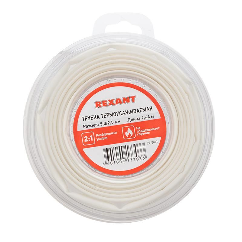 Трубка термоусаживаемая 5,0/2,5 мм белая, ролик 2,44 м от REXANT - это тонкостенный изоляционный элемент на основе полиолефина с коэффициентом усадки 2:1, предназначенный для защиты электрических соединений, герметизации кабелей и маркировки проводов. Артикулы etm29-0021 и 29-0021 подходят для монтажа в условиях широкого температурного диапазона и требуют минимальной подготовки поверхности.