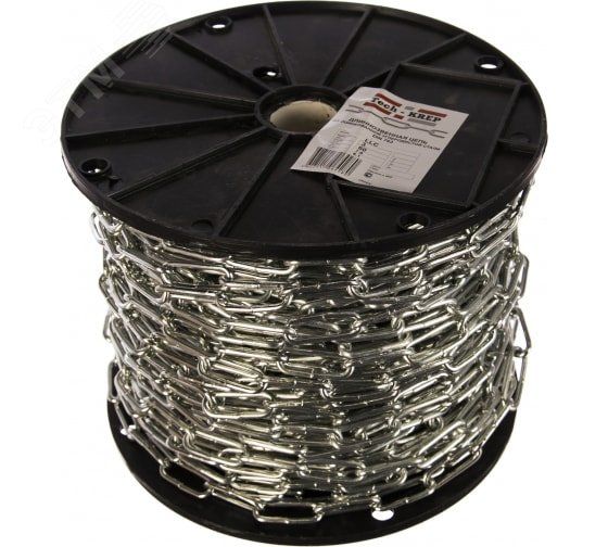 Цепь длиннозвенная DIN 763 (LLC) 8мм-накл. (уп.10м) Tech-KREP 103335 - это кольцевая цепь из стали с толщиной материала 8 мм. Она обладает предельной нагрузкой до 25 Н и защитным гальваническим/электролитическим цинковым покрытием на поверхности.