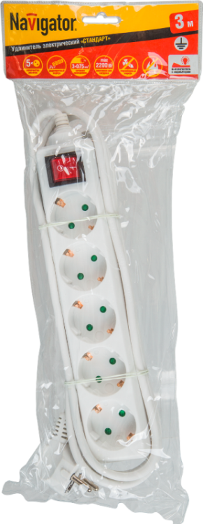 Удлинитель бытовой с выключателем 5 розеток, шнур 3 м, с заземлением, сечение 3x0.75 мм2, 10 А, IP20 от бренда Navigator (артикулы 71557 и 19258) - надёжное решение для временного подключения бытовых и офисных устройств. Он обеспечивает питание сразу пяти приборов через один вход, имеет встроенный выключатель и защиту от перегрузок.