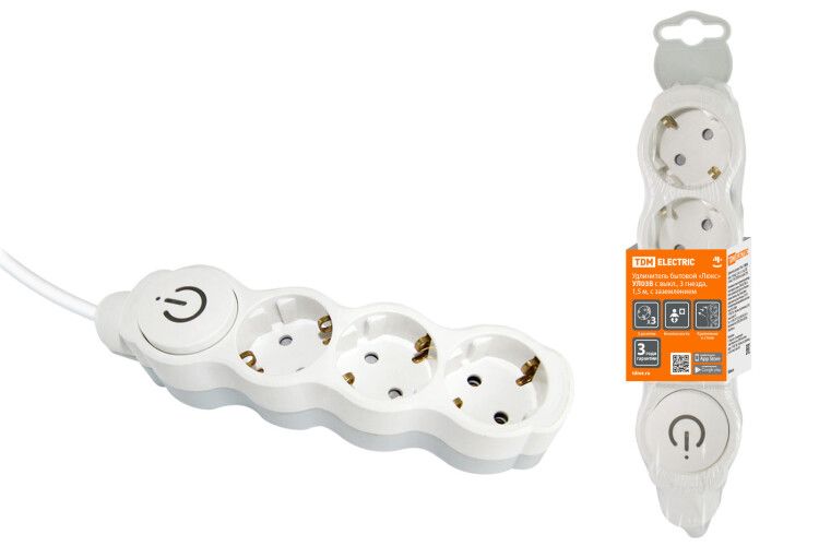 Удлинитель бытовой "Люкс" УЛ03В выкл, 3 гнезда, 1,5м, с/з, с з/ш, ПВС 3х1мм2 16А/250В бело-серый | SQ1303-0130 TDM