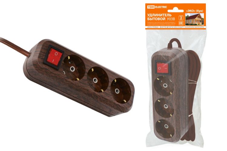 Удлинитель бытовой У03В выключатель, 3 гнезда, 5метров,2П+3, ПВС 3х1мм2 "Эко" (бук) 16А/250В | SQ1303-3102 TDM