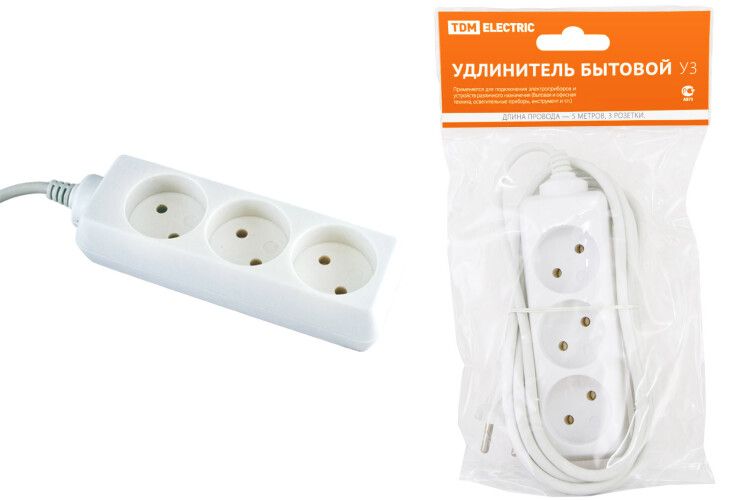Удлинитель бытовой У3 3 гнезда, 5метров, без заземления, ПВС 2х0,75мм2 10А/250В от TDM ELECTRIC - это удобное и безопасное решение для подключения различных электроприборов и устройств. Он идеально подходит для использования дома, в офисе или в загородном доме.