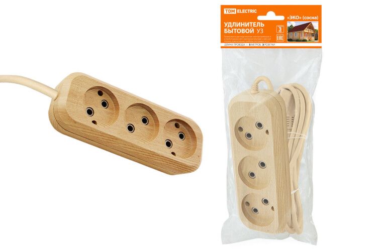 Удлинитель бытовой У3 3 гнезда, 5метров,2П б/з, ПВС 2х0,75мм2 "Эко" (сосна) 10А/250В | SQ1303-2202 TDM