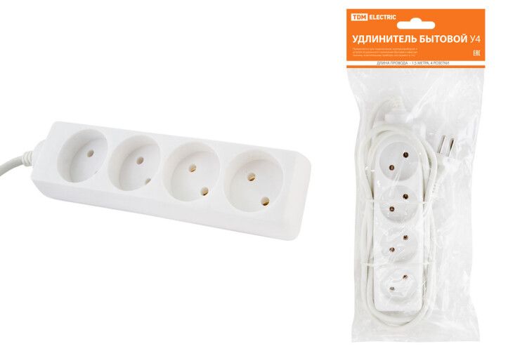 Удлинитель бытовой У4 4 гнезда, 1,5метра, без заземления, ПВС 2х0,75мм2 10А/250В | SQ1303-0210 TDM