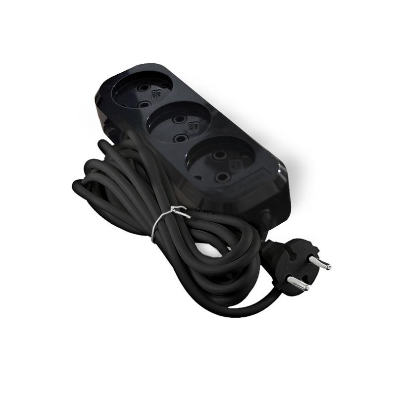 Удлинитель 3 метра без заземления 10 ампер IP20 Е-202/Е-203 ПВС 2х0.75 АБС-пластик черный совместим со всеми устройствами, использующими евроштекеры (CEE 7/7, Type F). Кабель ПВС гибкий, легко расправляется, но не предназначен для постоянной прокладки под напольными покрытиями или в условиях повышенной механической нагрузки. Установка осуществляется путём включения в стеновую розетку - никакой дополнительной сборки не требуется. Обязательно проверьте, что входная розетка имеет правильную полярность и исправна.