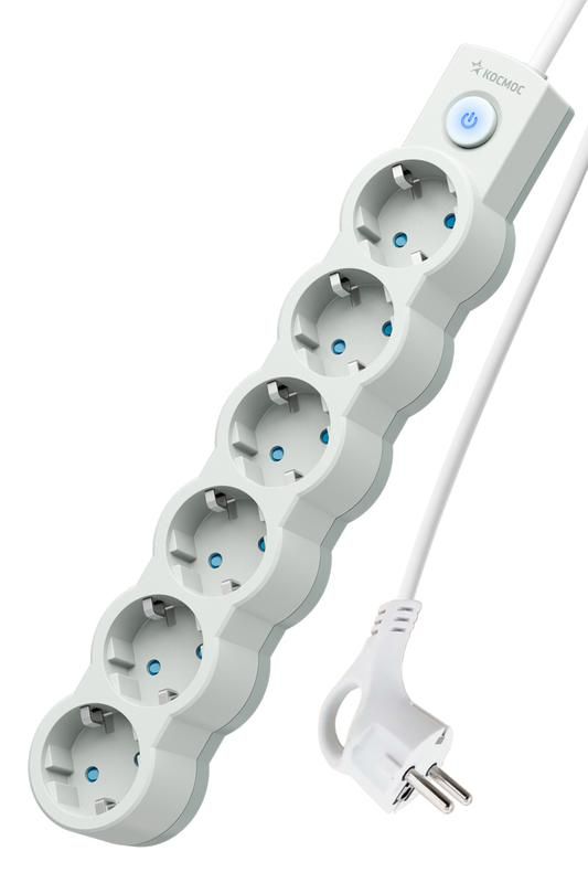 Удлинитель 3м ПВС 3х0.75 6 гнезд с заземлением, выключатель 10А, защитные шторки, белый от бренда КОСМОС предназначен для безопасного подключения нескольких бытовых и офисных устройств к одной розетке. Модель yksm3m-6g-z-v10a-w оснащена выключателем, защитными шторками и надежной изоляцией, что делает её подходящей для домашнего, рабочего и временного использования.