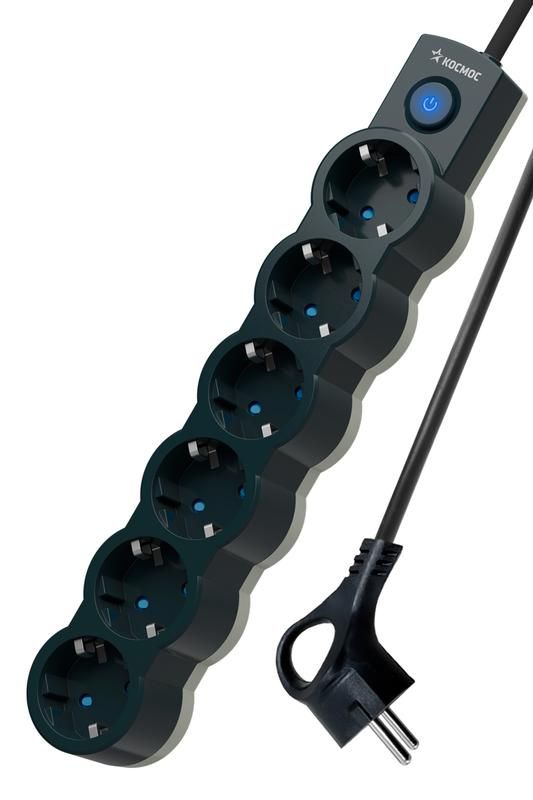 Удлинитель 6х5м с заземл. 10А IP20 2200Вт 220В защ. шторки ПВС 3х1 выкл. черн. КОСМОС YKsm5m-6g-Z-V10A-B