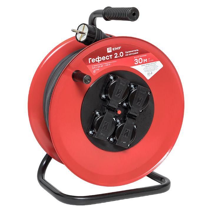 Удлинитель на катушке "Гефест 2.0" 4 гнезда 30м с заземлением и предохранителем КГ 3*2,5 16А/3,5кВт IP44 PROxima | UKG02-16-R325-4-30-IP44 EKF