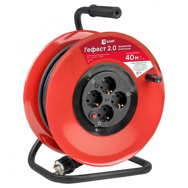 Удлинитель на катушке "Гефест 2.0" 4 гнезда 40м с заземлением и предохранителем КГ 3*1,5 16А/3,5кВт PROxima | UKG02-16-R315-4-40 EKF
