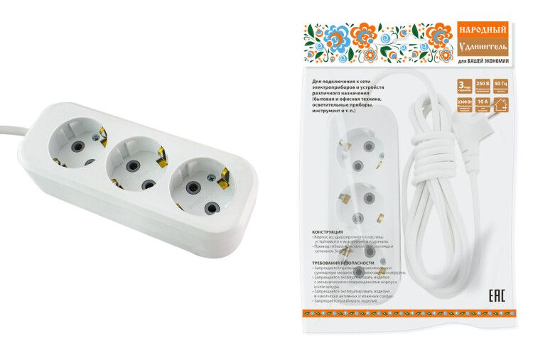 | Удлинитель бытовой 3 гнезда 1,5м с заземлением ПВС3х0,75 10А 2200Вт УН03 белый TDM SQ1303-1040 | 19.02.2026 | 4 шт. | 242,28 ₽ | шт. | от 3 дней |