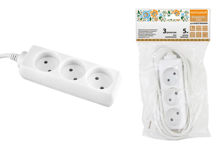 Удлинитель народный УН3 3 гнезда, 5метров, б/з, ШВВП 2х0,75 мм2 6А/250В | SQ1303-1202 TDM