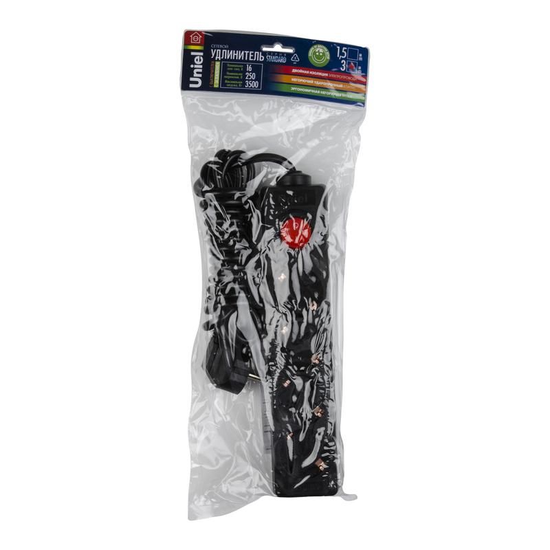Удлинитель Uniel UL-00003610 - надёжное решение для временного подключения оборудования с заземлением. Чёрный корпус и три метра провода обеспечивают удобство использования на производстве, в мастерских и дома.