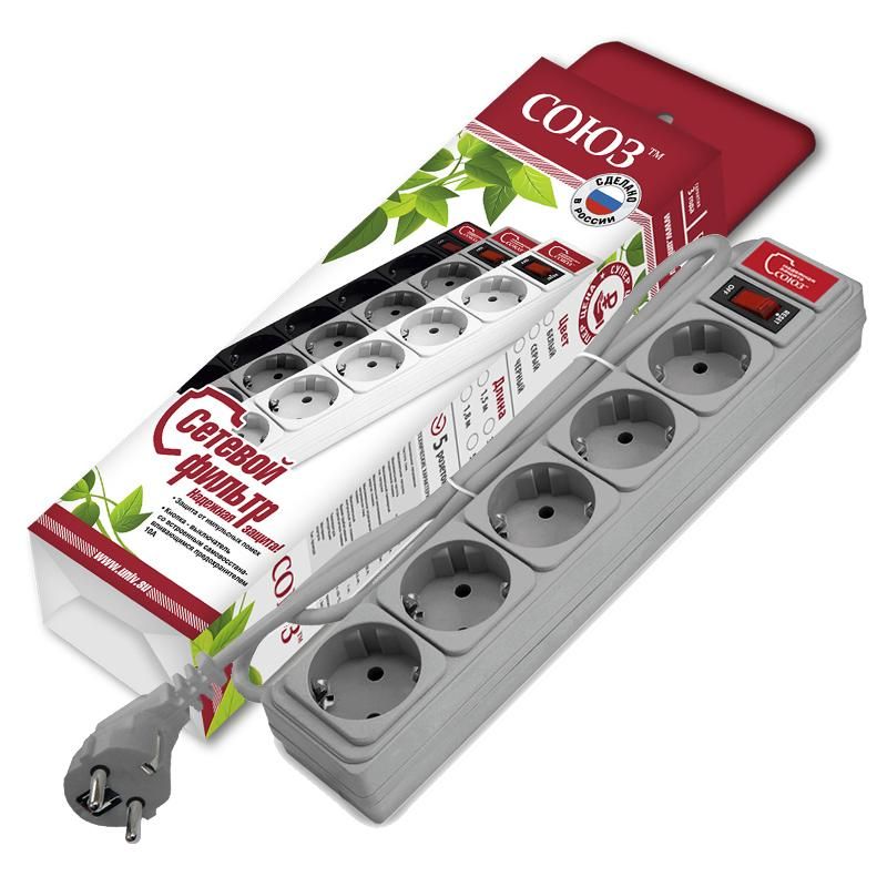 Удлинитель с сетевым фильтром 5х1.5м 10А IP21 ПВС 3х0.75 сер. (премиум упак.) Союз 1328К