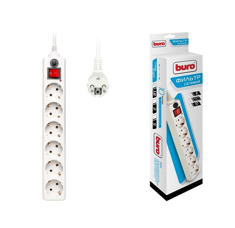 Удлинитель с сетевым фильтром 6х1.8м заземл. 10А IP20 600SH-1.8-W 2.2кВт CCA бел. BURO 992246