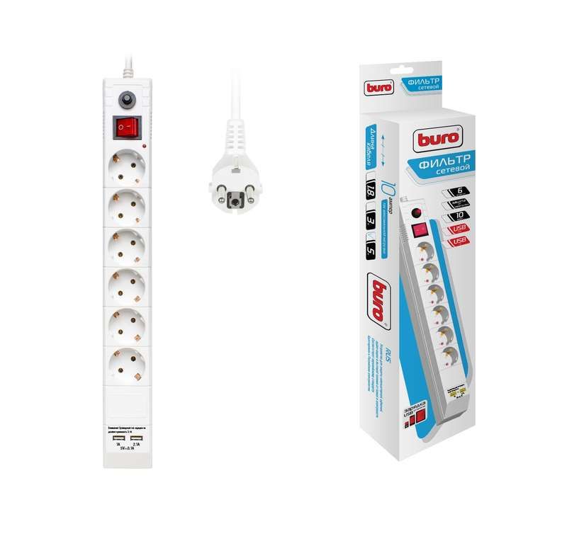 Удлинитель с сетевым фильтром 6х5м заземл. 10А IP20 BU-SP5_USB_2A-W CCA бел. BURO 992316