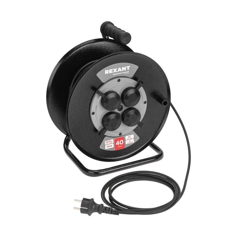 Удлинитель силовой КГ на катушке 4 гнезда, с/з, 40м, 3х1,5мм², IP44 c защитными крышками, металлическая катушка | 13-5012 REXANT MEET