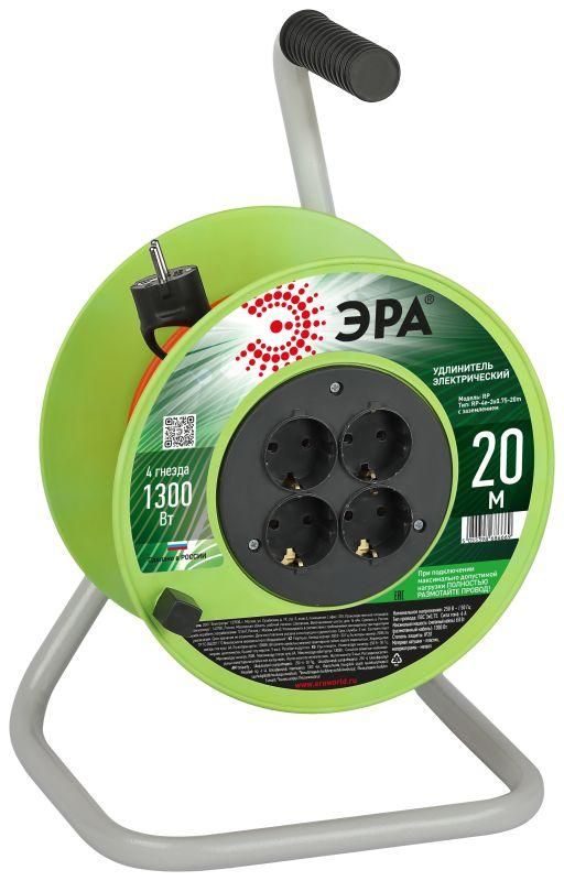 Удлинитель силовой RP-4e-3х0.75-20m на пластиковой катушке c заземлением 4 розетки 20м ПВС 3х0,75мм2 | Б0056096 ЭРА