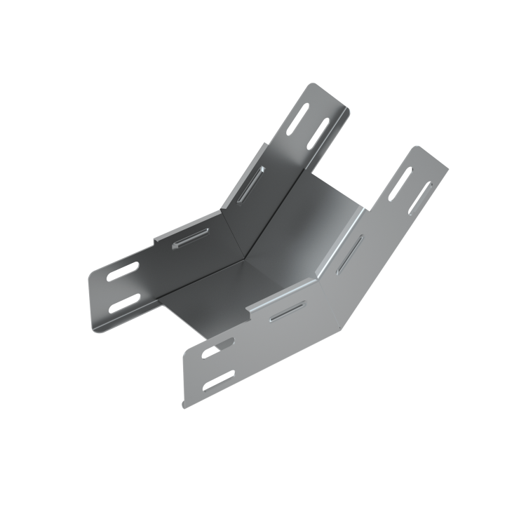 Угол внутренний вертикальный 45 градусов 50х150 мм сталь 0.8 мм совместим исключительно с лотками серии того же производителя, имеющими аналогичные габариты: 150 мм шириной и 50 мм высотой борта. Соединение осуществляется через интегрированные лепестки - они плотно заходят в кромки смежных элементов, формируя жёсткий стык без дополнительных деталей. Монтаж выполняется с помощью болтов через NATO-отверстия (диаметр отверстий рассчитан под M6–M8). Рекомендуется использовать одинаковые типы крепёжа по всей трассе для равномерной нагрузки.