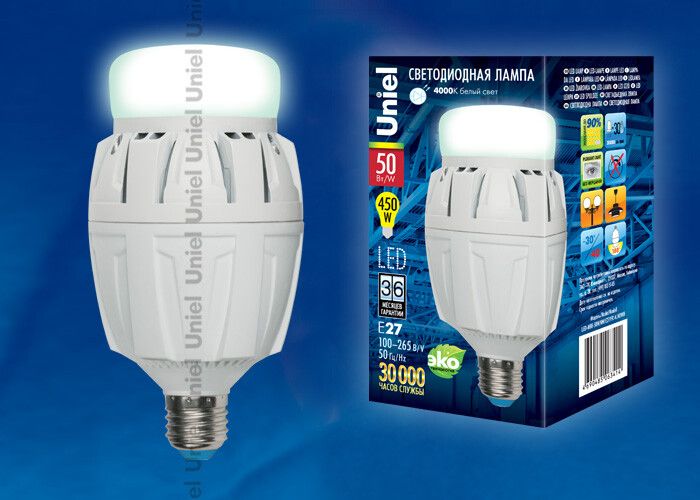 Лампа светодиодная LED 50Вт 100-265В E27 4000К, серия Venturo, материал корпуса алюминий, с матовым рассеивателем - это мощный источник света для замены старых ламп накаливания, ГЖ и НЛ на промышленных объектах. Бренд Uniel предлагает эту модель под артикулом 08979 как надежное решение для больших помещений с высокими потолками.