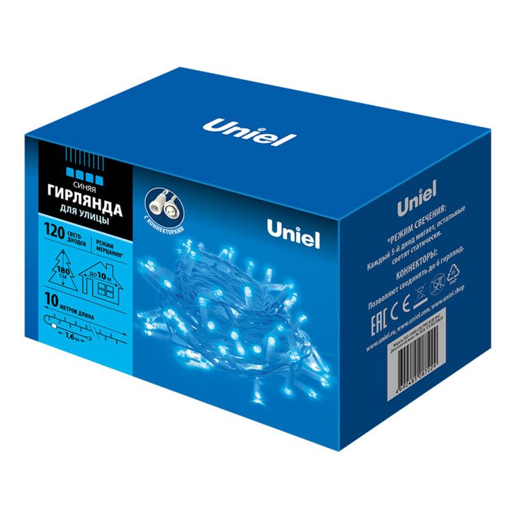 Гирлянда светодиодная ULD-S1000-120/TWK BLUE IP67 10м 120 светодиодов синий свет соединяемая - это уличный осветительный элемент с эффектом мерцания, рассчитанный на длительную работу при любых погодных условиях. Благодаря защищённому исполнению и возможности соединения нескольких единиц, её удобно использовать для декорирования фасадов, террас и объектов внешнего освещения. Производитель Uniel обеспечивает гарантию 12 месяцев и заявляет срок службы до 50 000 часов.