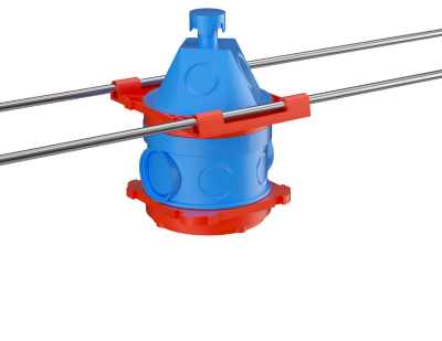 Коробка универсальная потолочная для заливки в бетон, 90х71, высота 114 мм монтируется в арматурный каркас с помощью металлического прутка, который проходит через специальные отверстия. Установка должна происходить до заливки бетона - коробка фиксируется так, чтобы её верхний край был заподлицо с поверхностью будущего потолка. Для подключения используются гофрированные трубы диаметром 20–25 мм, которые вставляются в предварительно подготовленные вводы. Коробки можно стыковать друг с другом через два ввода диаметром 25 мм, расположенные на боковой поверхности - это удобно при формировании сложных сетей распределения.