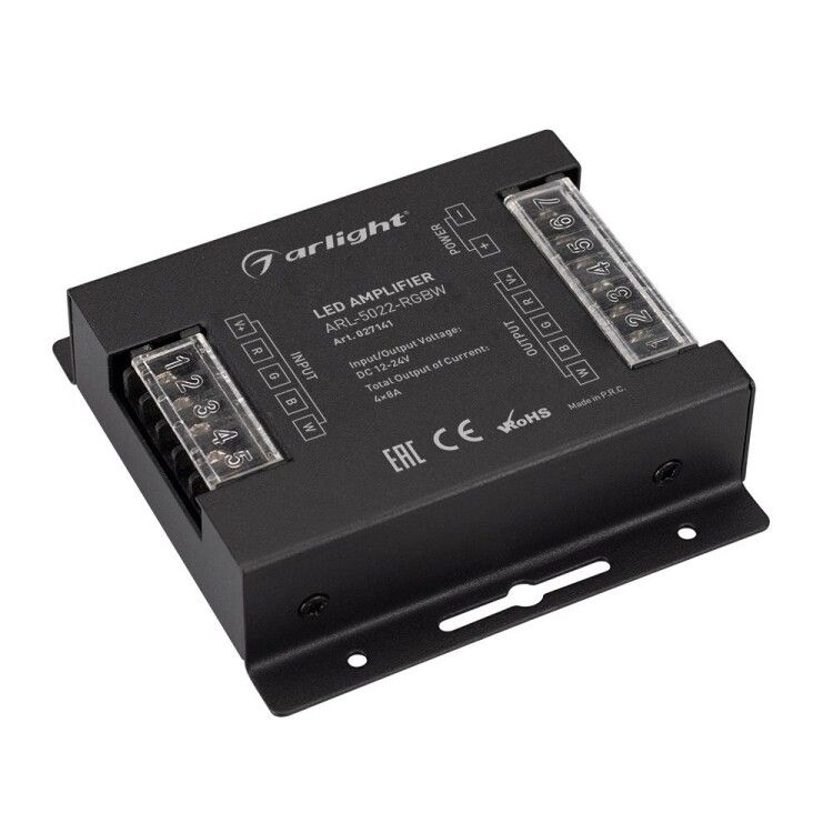 Усилитель ARL-5022-RGBW 12-24V 4x8A 384-768W IP20 Металл от Arlight предназначен для усиления управляющего сигнала от контроллера светодиодной ленты, обеспечивая равномерную яркость на длинных участках. Этот усилитель применяется там, где основной сигнал теряет силу, а мощность ленты превышает возможности контроллера.