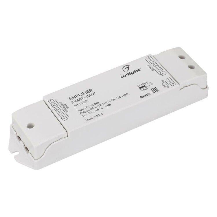 Усилитель SMART-RGBW 12-24V 4x5A IP20 пластик от Arlight предназначен для усиления управляющего сигнала светодиодной ленты RGBW при подключении длинных участков или нескольких лент параллельно. Артикул 023831 обеспечивает стабильную работу без потерь яркости и цветопередачи.