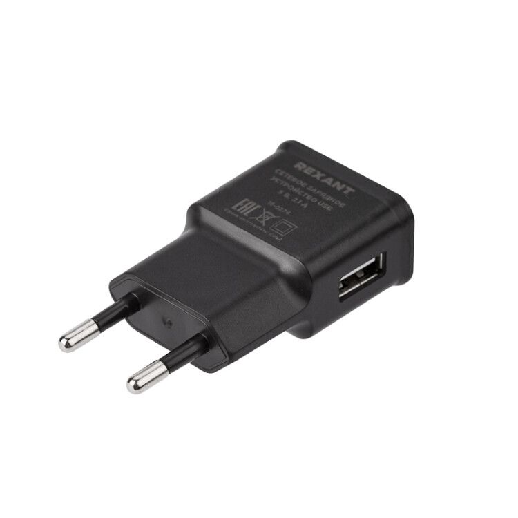 Устройство зарядное сетевое USB, 5V, 2.1A, черное от REXANT - компактный адаптер для питания портативных устройств через розетку 220 В. Артикул etm16-0274 подходит для ежедневной зарядки смартфонов, планшетов и других гаджетов с интерфейсом USB-A.